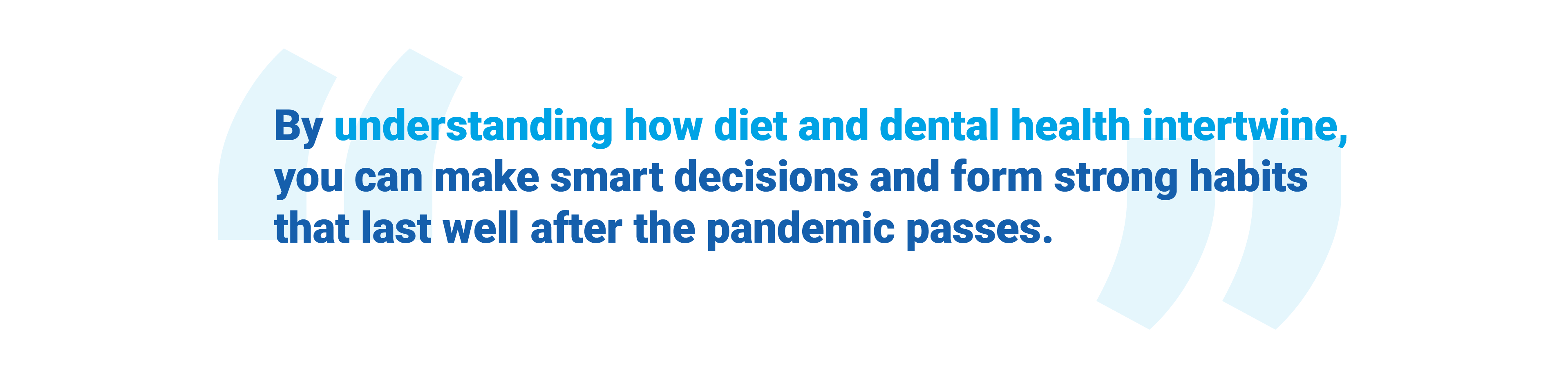 You probably know that what you eat affects everything from energy levels to heart health. It’s likely no surprise, then, that your diet also impacts dental health. Too many sugary foods, for example, can cause cavities. Diet is important in any situation, of course. It’s all too easy for occasional work breaks to become snack breaks when your desk is 10 feet away from the kitchen (this author is guilty as charged). And comfort food can become even more tempting under the stress of current events.