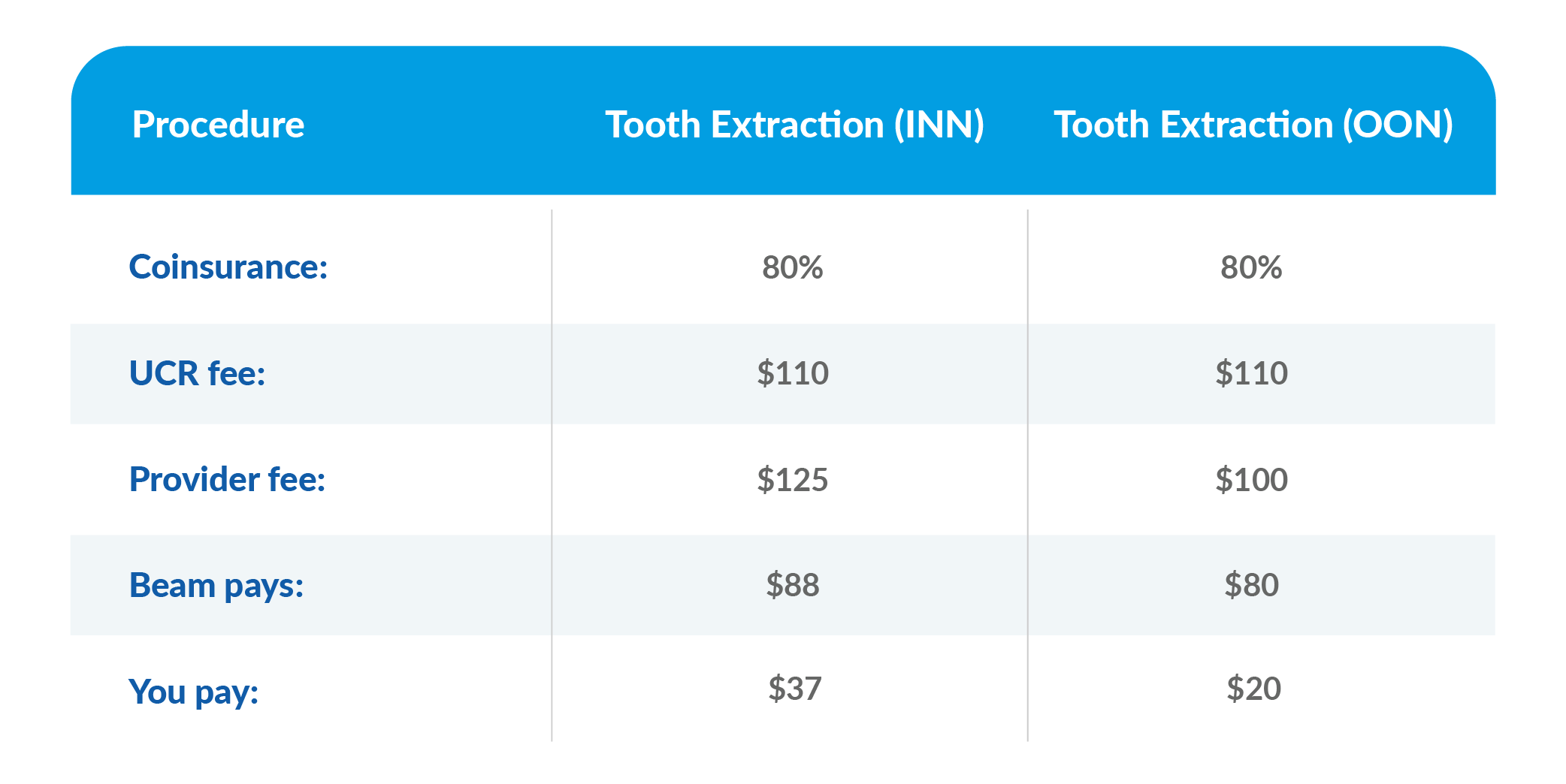 Now, let’s pretend your provider is out-of-network. In this scenario, the provider still charges $125 for the extraction and Beam would still cover 80% of the MAC fee ($80). Because the provider is out-of-network, they aren’t obligated to accept the MAC fee, which means they’re still owed $125 in total. Assuming your deductible has already been met, you would pay the remaining $45 owed.