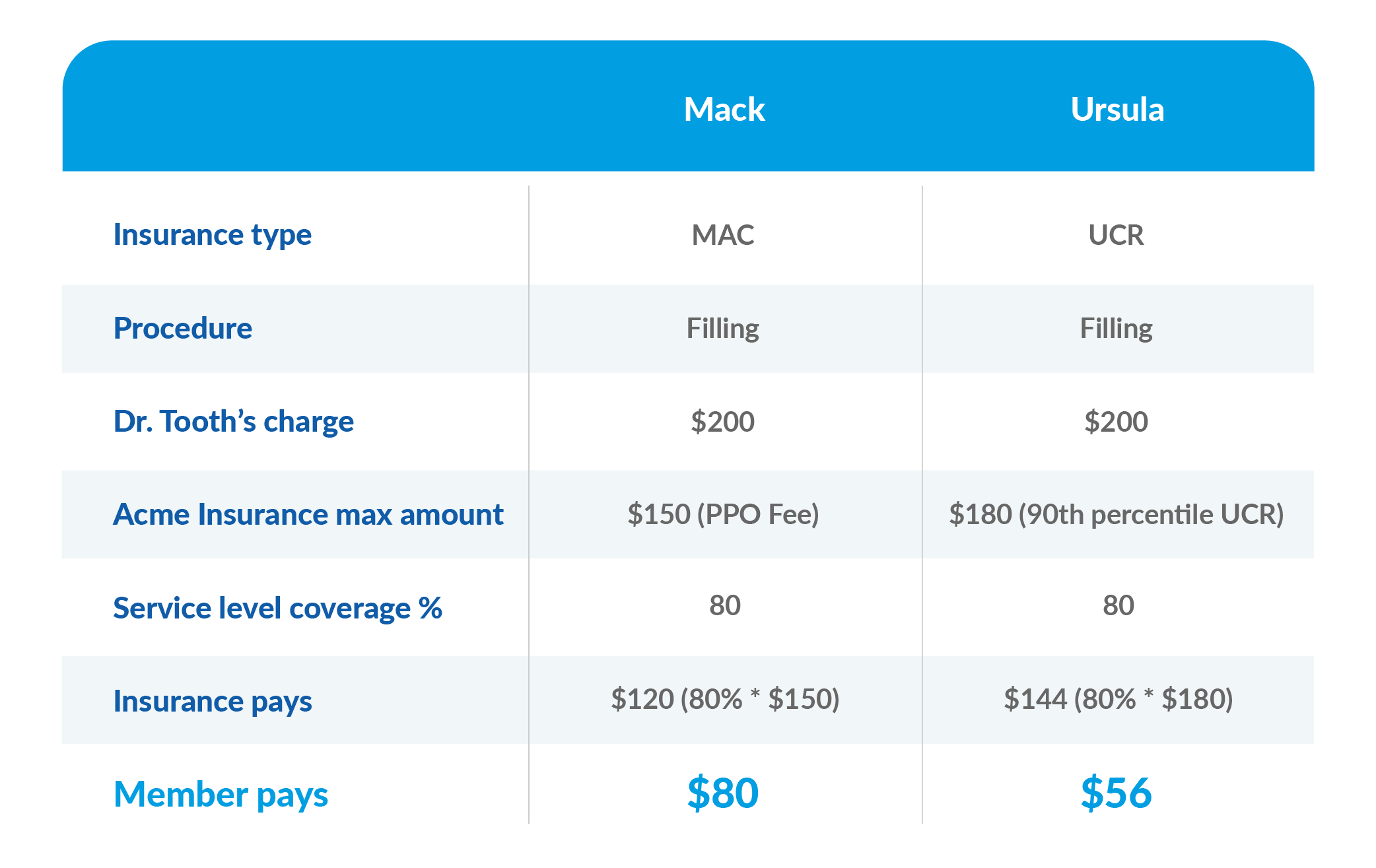 Later that day, Ursula has her appointment. Ursula is also enrolled in an Acme Insurance plan, but hers is a UCR plan. The UCR percentile on her plan is set at 90%, which comes out to a UCR Value of $180 in her area. Dr. Tooth charges $200 for a filling, so Acme Insurance will cover $144 (80% * $180) and Ursula will cover the remaining $56.