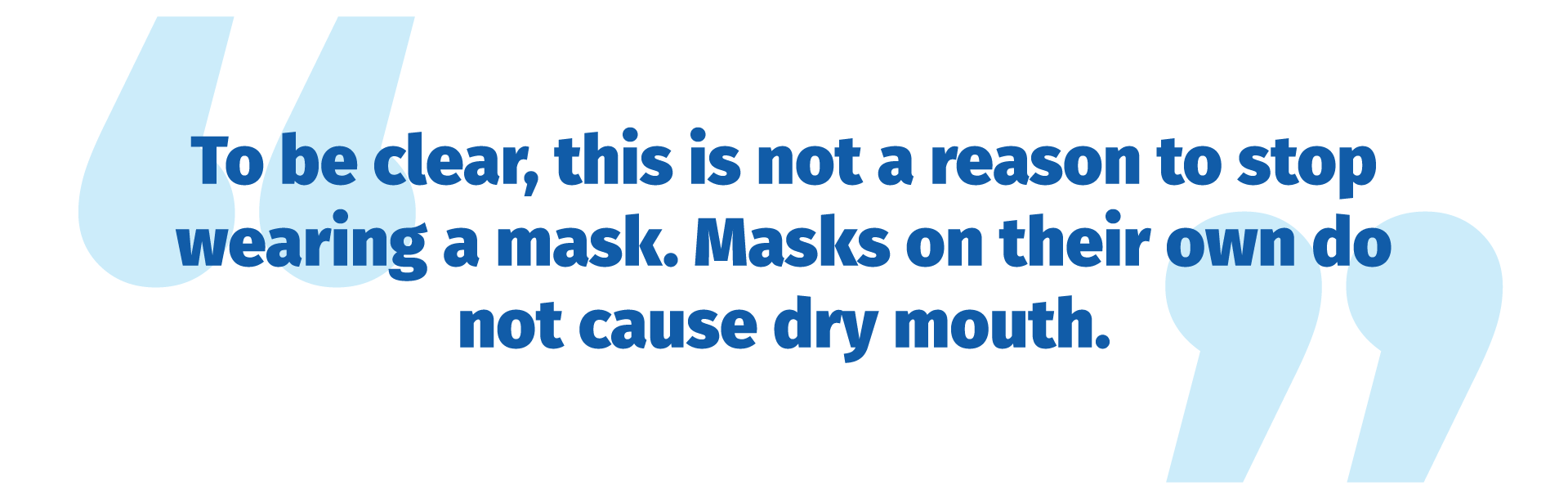 To be clear, this is not a reason to stop wearing a mask. Masks on their own do not cause dry mouth. Failing to stay hydrated and breathing through your mouth can cause dryness even without a mask.5 However, making a few behavioral changes while wearing a mask can help you prevent dry mouth.