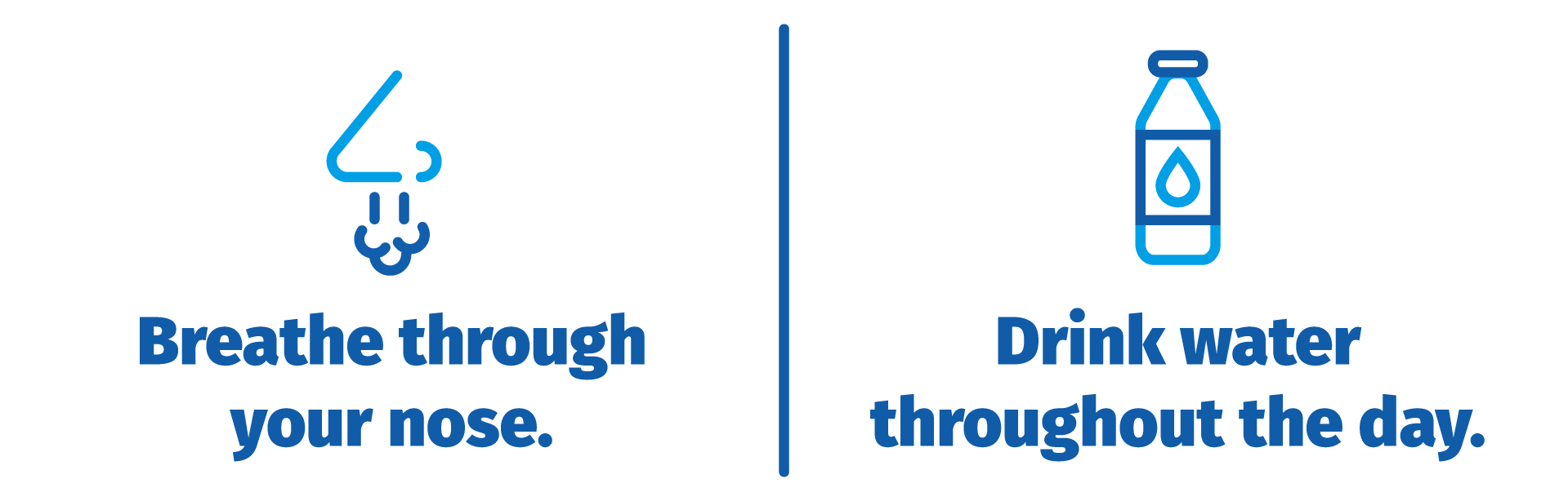 When you’re wearing a mask, make a conscious effort to breathe through your nose. Not only does it keep your mouth from drying out, but it also allows your body to better absorb oxygen and helps protect the immune system from infection. If you’re congested and unable to breathe through your nose, consider taking an over-the-counter decongestant or consult your doctor for appropriate treatment.5